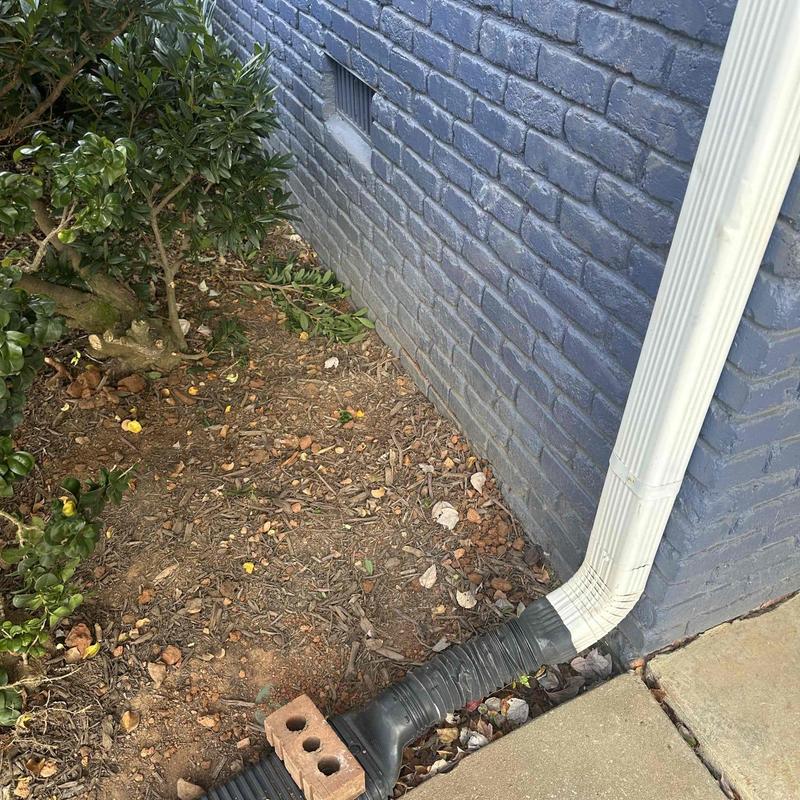 VAC TRUCK SERVICES completed a plumbing job in Charlotte, NC, involving excavation along the foundation wall to access piping. The work included installing and repairing an underground pipe connection and extending a downspout with a flexible drainage tube secured by a brick. Two service vehicles were used on site.