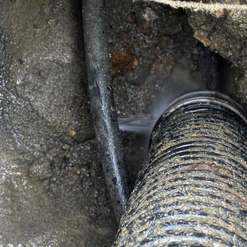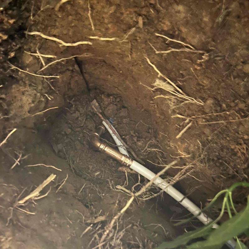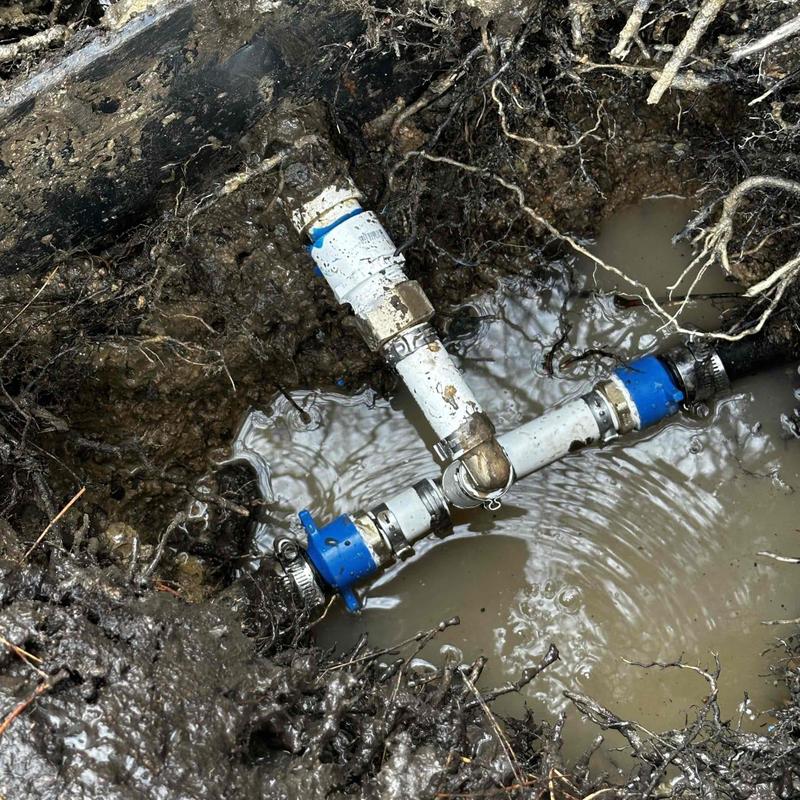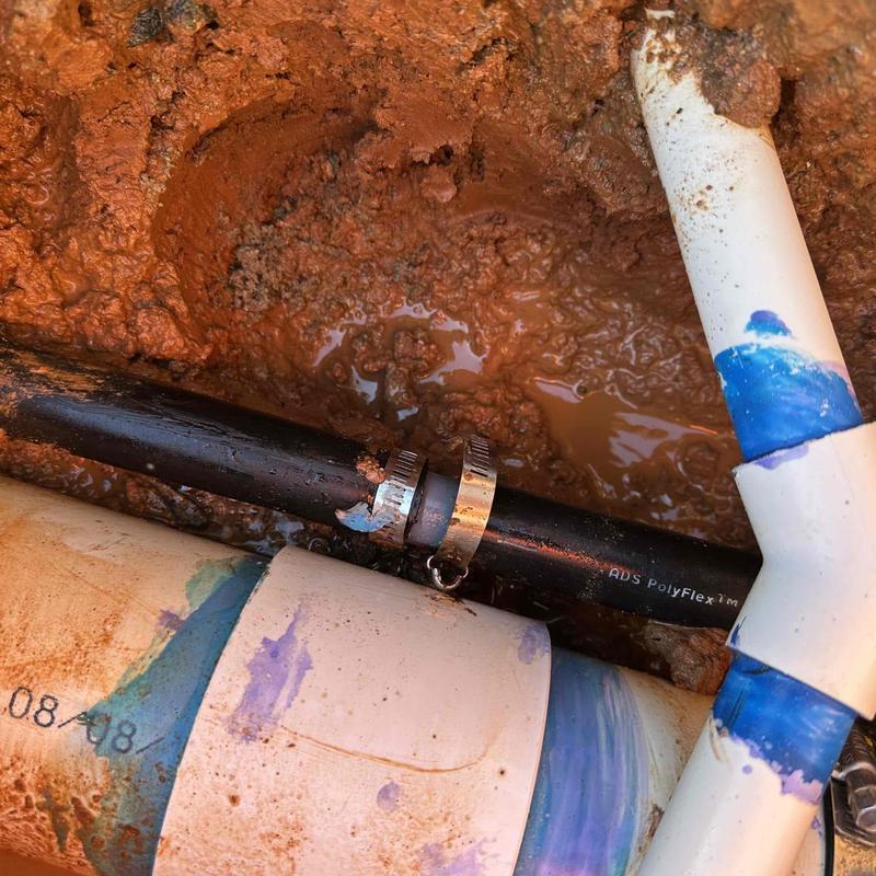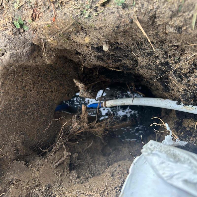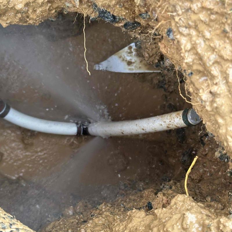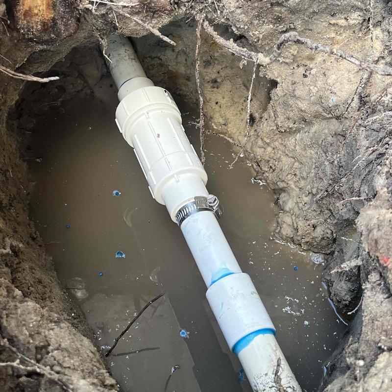 VAC TRUCK SERVICES completed plumbing repairs involving excavation and replacement of underground pipes at a residential property in Roswell, GA. The work included exposing damaged pipes, fitting new sections with seal clamps, and reconnecting PVC piping within the yard area.