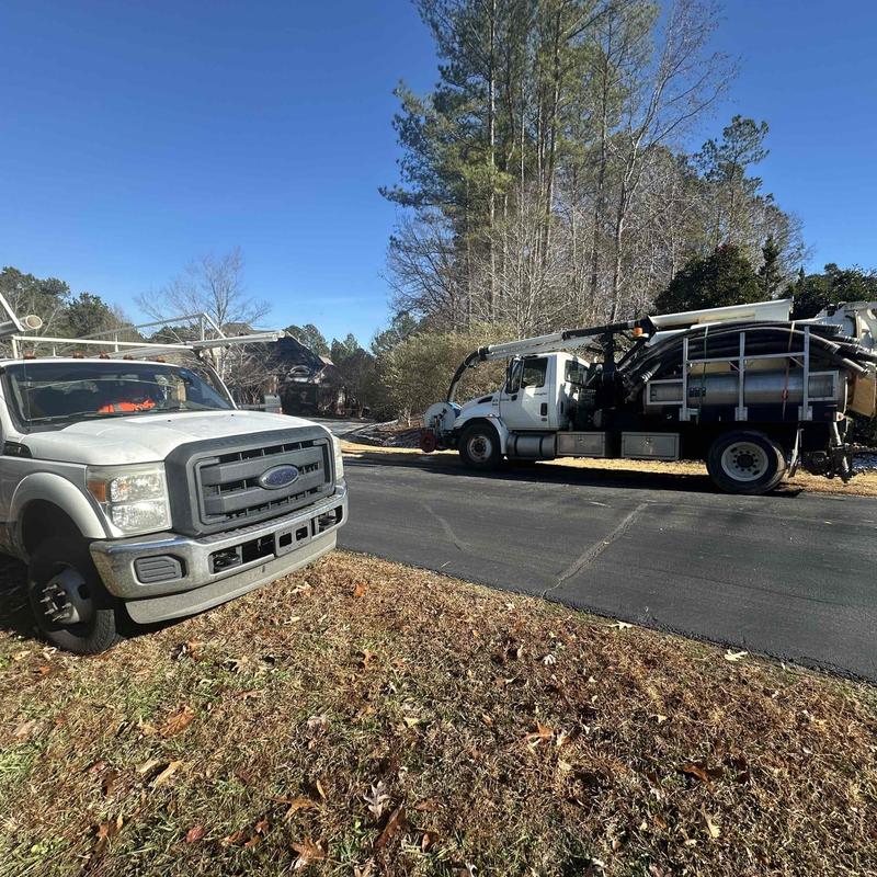 VAC TRUCK SERVICES performed sewer cleaning or maintenance at a residential property in Fuquay-Varina, NC. The work involved using specialized vacuum and plumbing trucks to clear and service underground plumbing lines, as indicated by the equipment and cleaned driveway surfaces visible at the site.