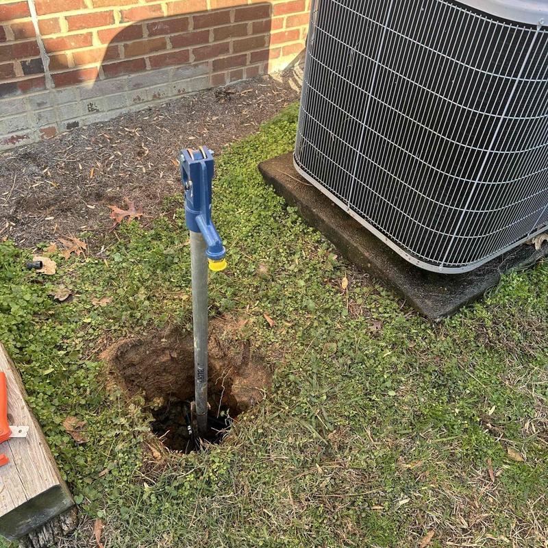 VAC TRUCK SERVICES completed pipe repair and installation work in Raleigh, NC. The project involved digging a trench, installing a vertical outdoor water spigot, and connecting multiple black plastic pipes secured with hose clamps. The work was performed adjacent to an HVAC unit on the property.