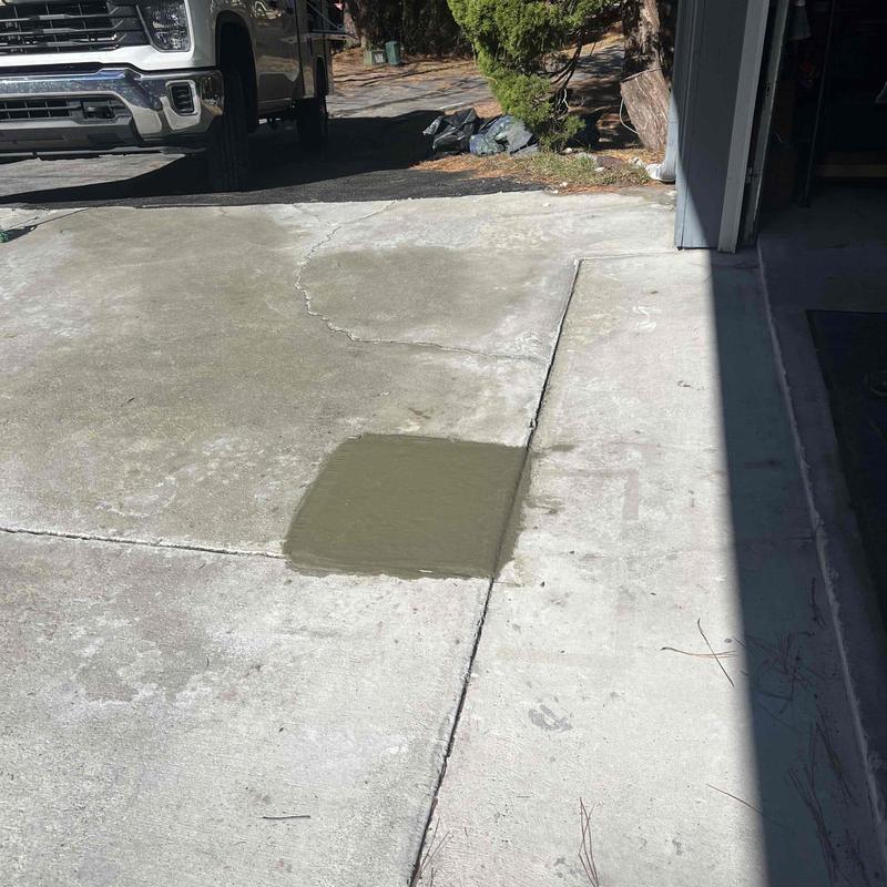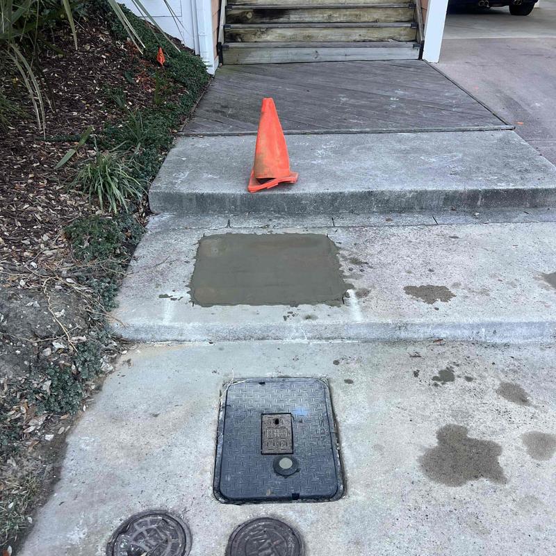 VAC TRUCK SERVICES completed plumbing repairs in Colorado Springs, CO. The work involved replacing a section of underground PVC pipe with a new coupling and fittings, followed by patching the concrete driveway above the repair site.