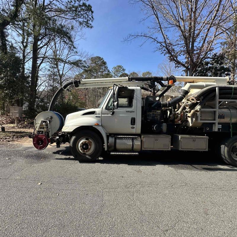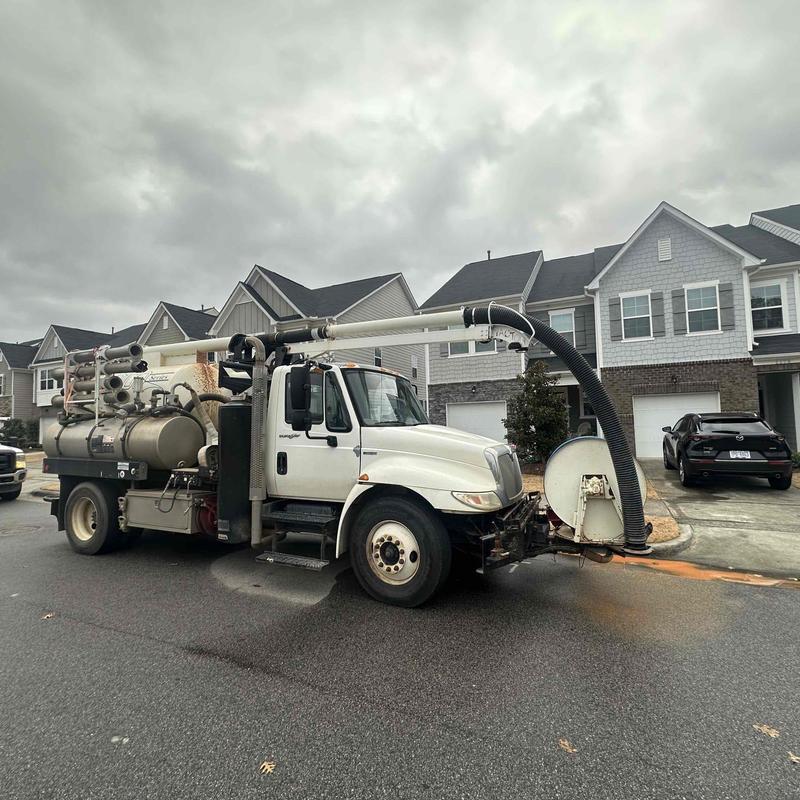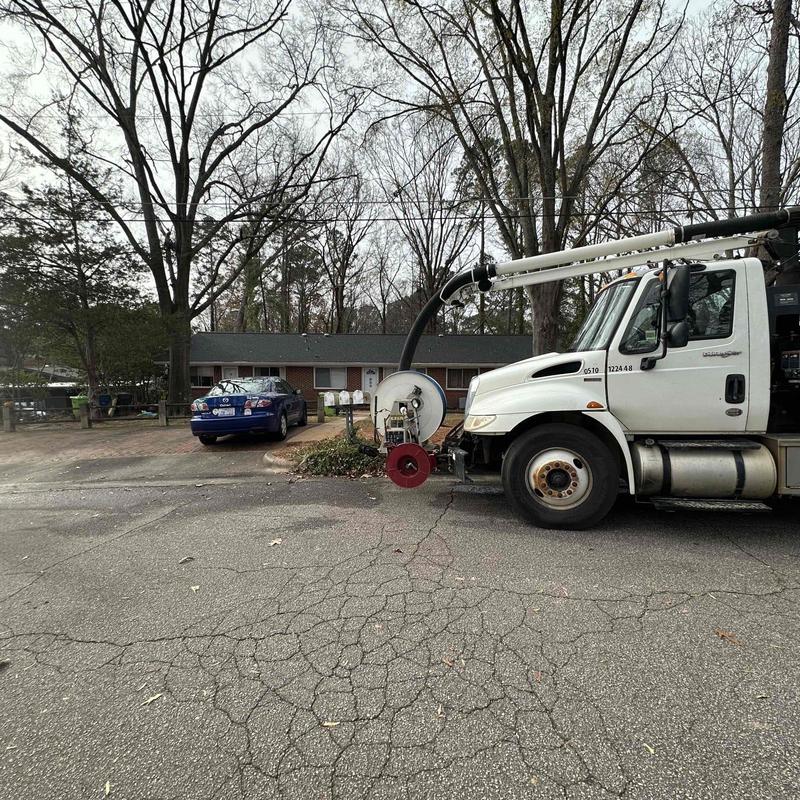 VAC TRUCK SERVICES used a vacuum truck to perform plumbing-related cleaning or pipe maintenance for a customer in Raleigh, NC. The truck is equipped with hoses and a reel, indicating a service likely involving debris or clog removal from underground pipes or drains.