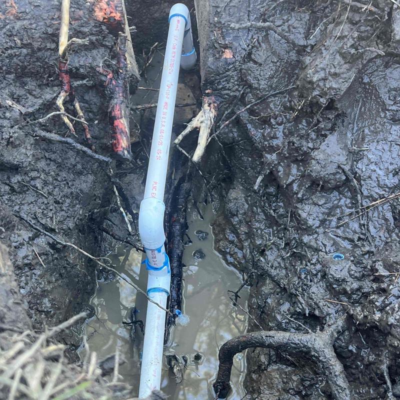 VAC TRUCK SERVICES completed a plumbing repair in Griffin, GA, replacing underground PVC piping surrounded by tree roots and muddy soil. The work involved excavation to expose the damaged pipes, followed by installation of new PVC piping. The area was then restored to ground level showing signs of recent digging and cleanup.