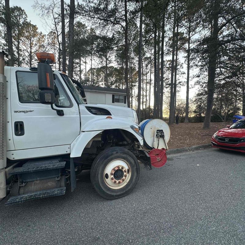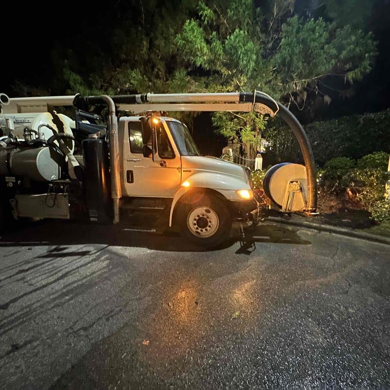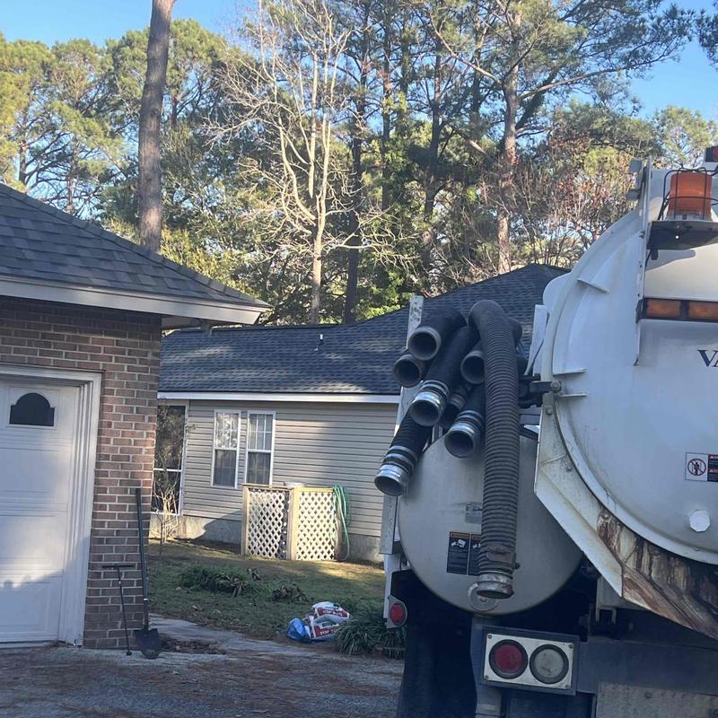 VAC TRUCK SERVICES completed a plumbing-related service at a residential property in Conway, SC. The work involved excavation near a cracked concrete driveway and the use of a specialized truck equipped with hose reels and cleaning or flushing equipment, likely for sewer or drain line maintenance or repair.