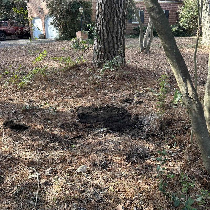 VAC TRUCK SERVICES completed pipe repair work in Charleston, SC. The job involved excavating soil and tree roots to expose and replace damaged PVC plumbing pipes. After the repair, the excavation site was backfilled and covered with soil and landscaping mulch to restore the area.