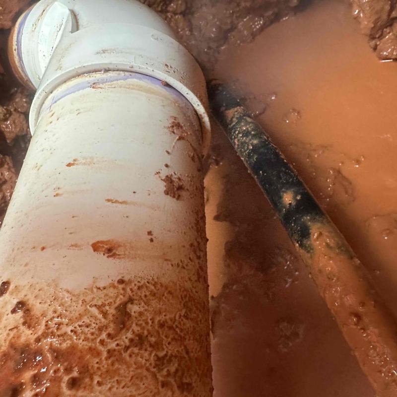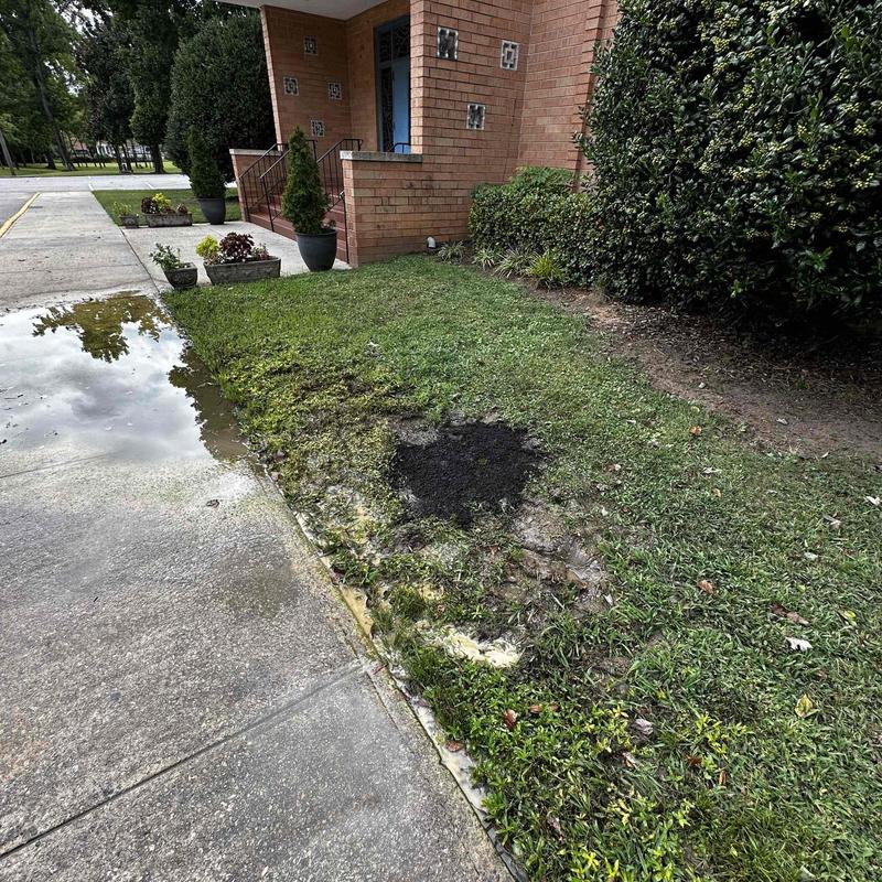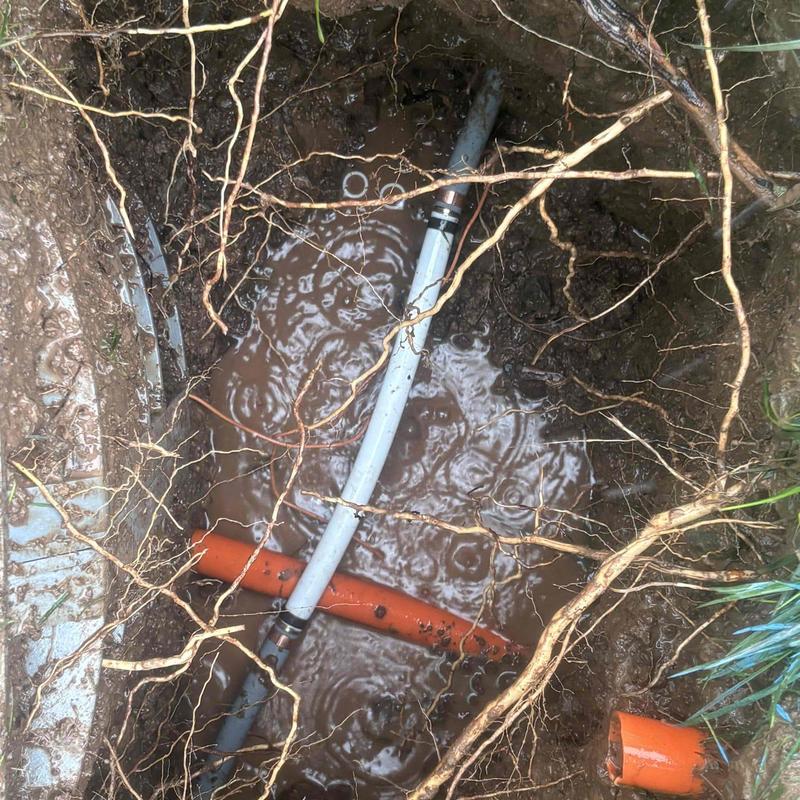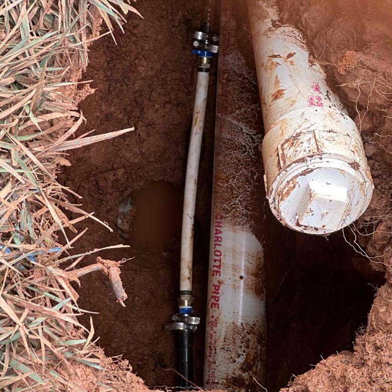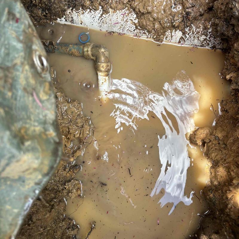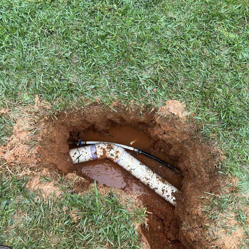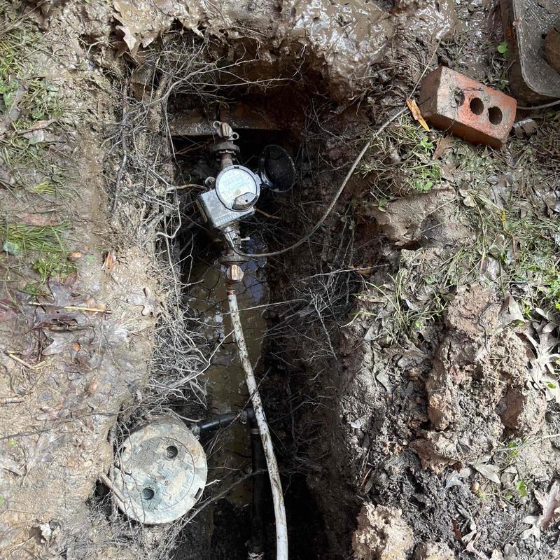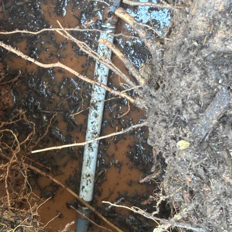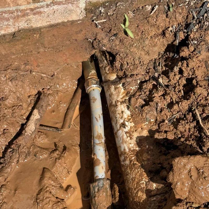 VAC TRUCK SERVICES completed a plumbing repair in Dalton, GA. The work involved excavating a muddy area to access and replace a section of underground pipe. The repair addressed leakage, as indicated by the wet ground and standing water near the excavation site.
