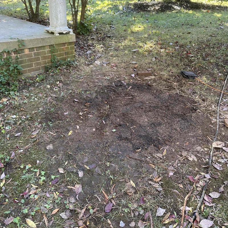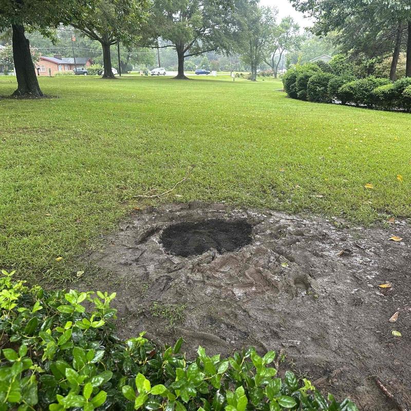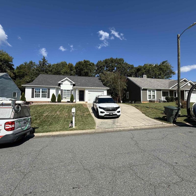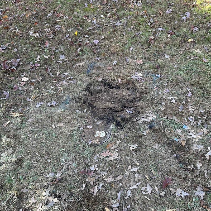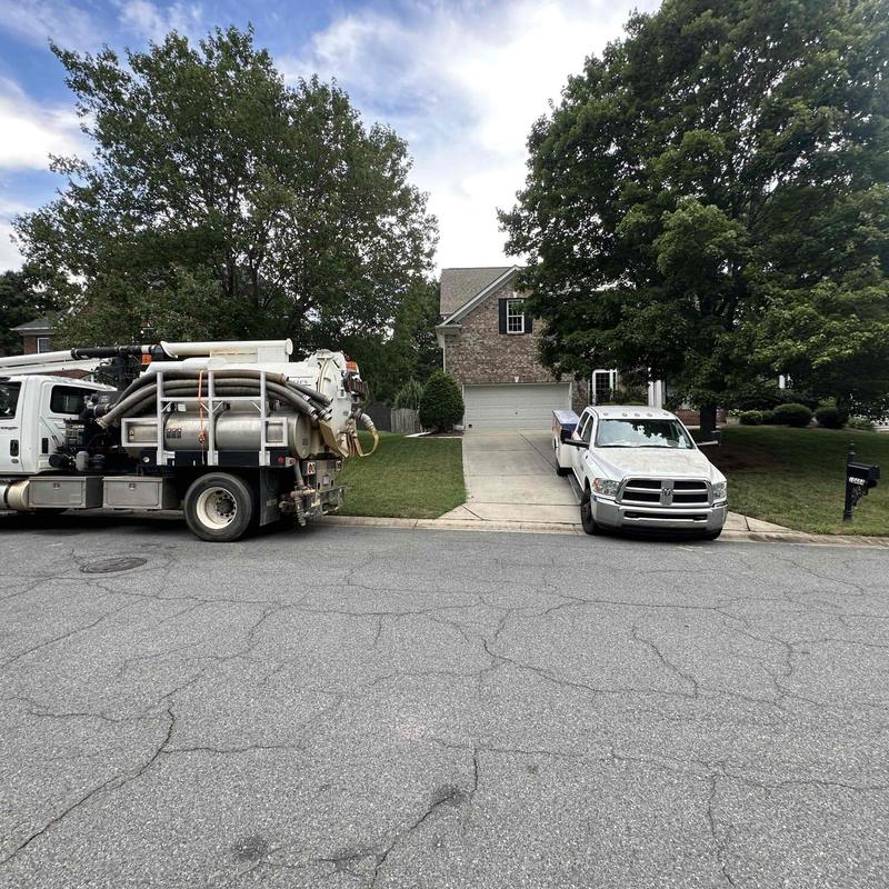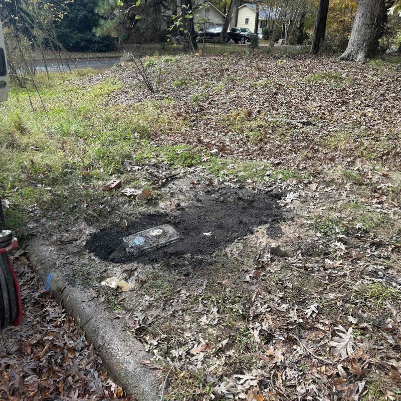 VAC TRUCK SERVICES performed excavation and cleaning of an underground pipe in a residential lawn in Winston-Salem, NC. The work involved digging to access the pipe, followed by using specialized equipment to remove debris and ensure the pipe was clear of obstructions.