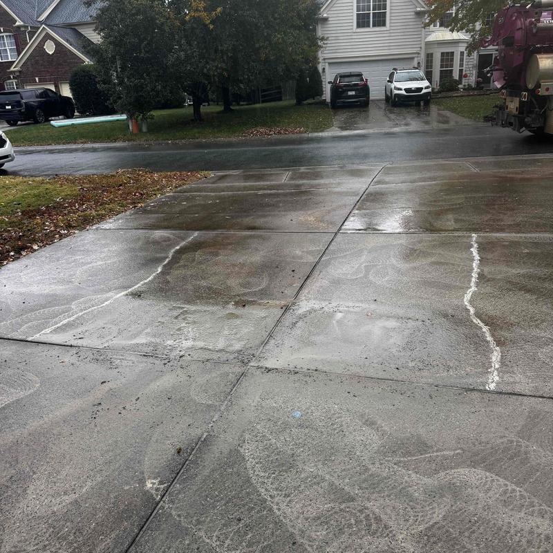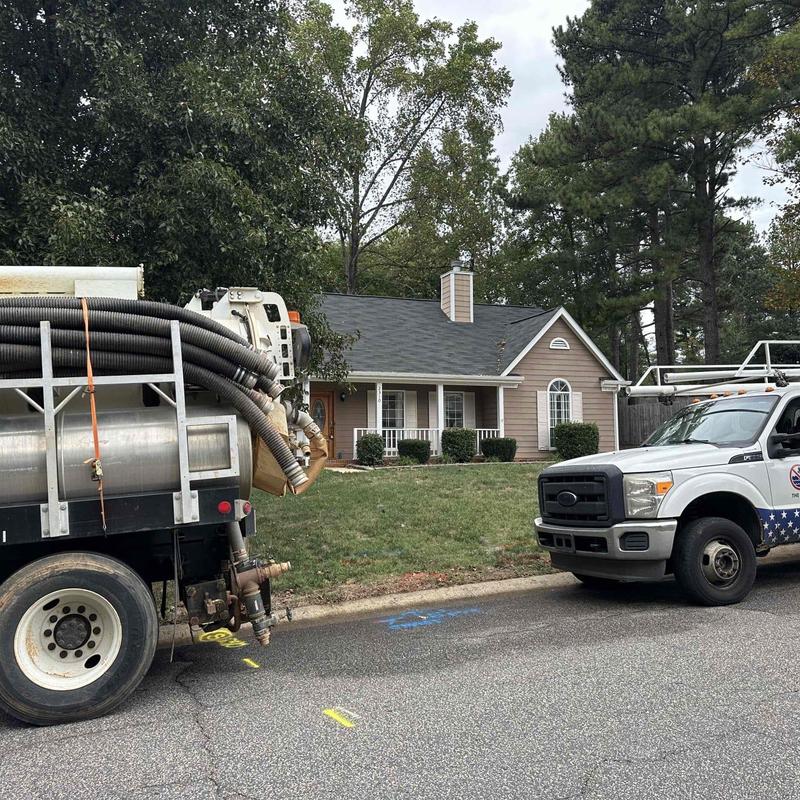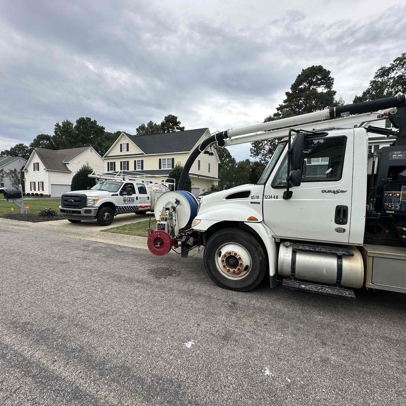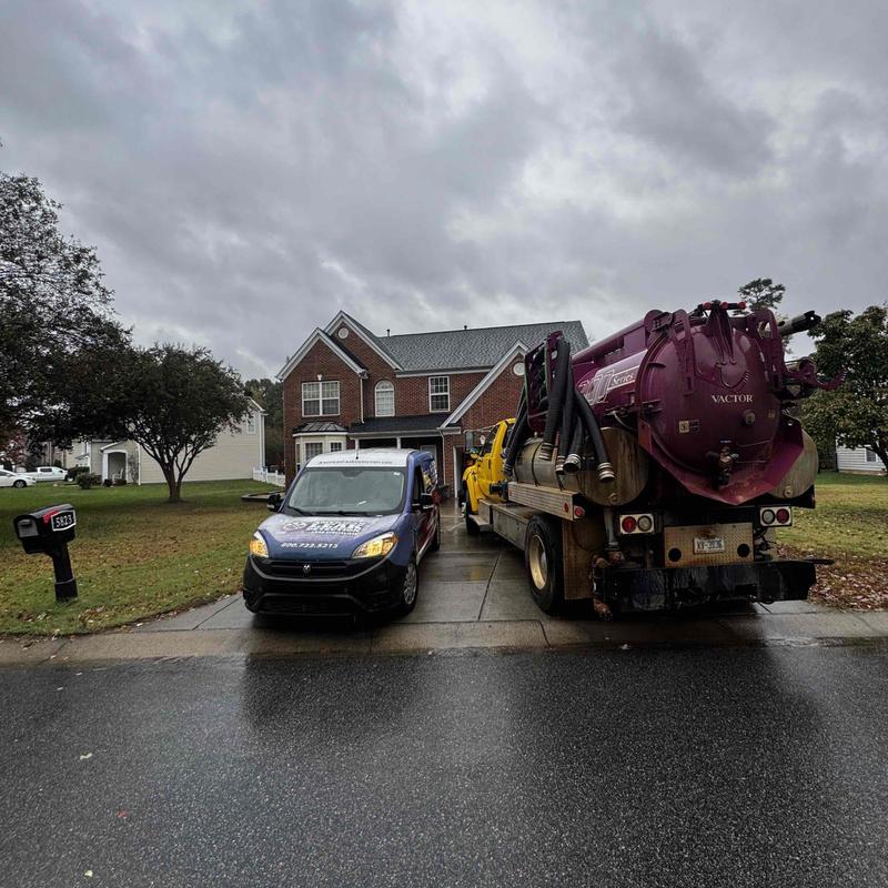 VAC TRUCK SERVICES performed sewer cleaning or maintenance at a residential property in Fuquay-Varina, NC. The work involved using specialized vacuum and plumbing trucks to clear and service underground plumbing lines, as indicated by the equipment and cleaned driveway surfaces visible at the site.