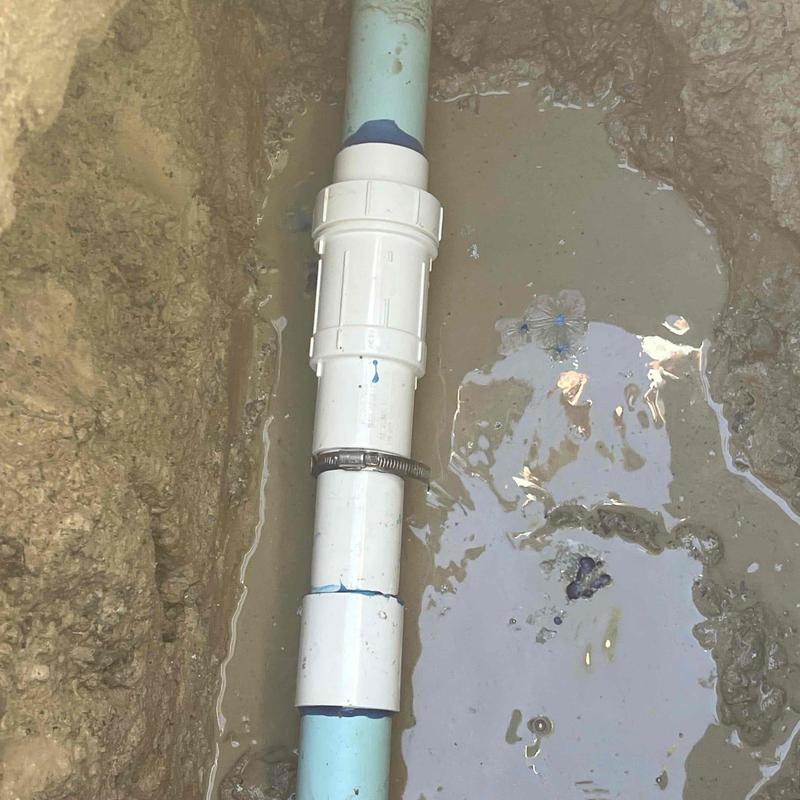 VAC TRUCK SERVICES performed underground plumbing repairs involving pipe replacement and fitting installation. The work took place in Chattanooga, TN, where a section of damaged pipe was exposed, removed, and replaced with new copper and PVC components, including a coupling and elbow joint, to restore the plumbing system.