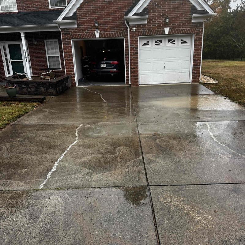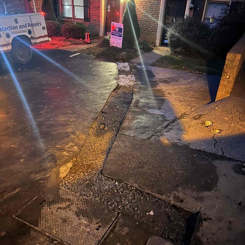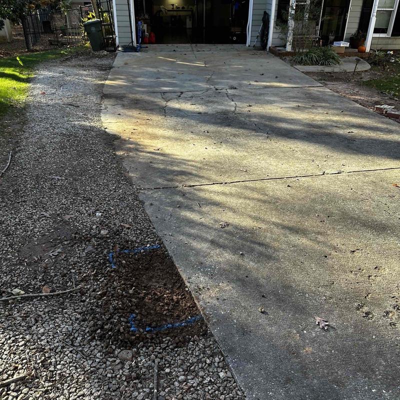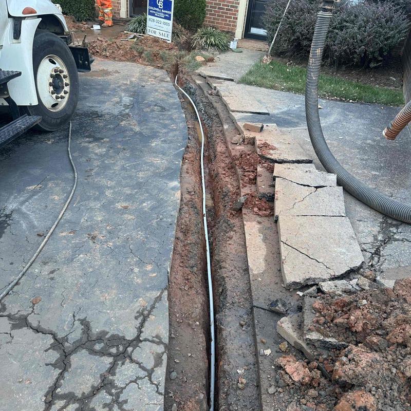 VAC TRUCK SERVICES completed trench excavation and pipe installation along a cracked driveway at a residential property in Hickory, NC. The work included breaking up concrete, laying a new pipe in the trench, and preparing the area for repair with gravel before restoration.
