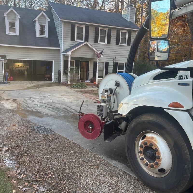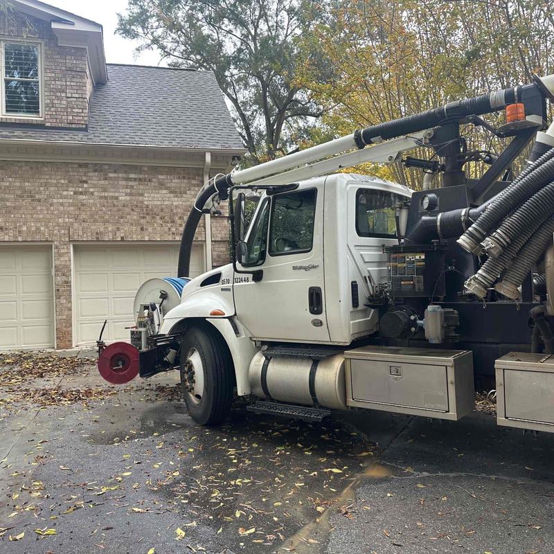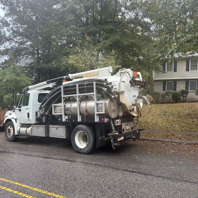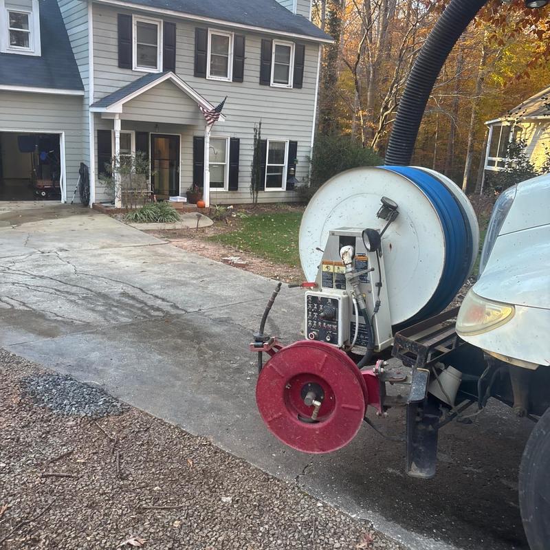 VAC TRUCK SERVICES completed a plumbing-related service at a residential property in Conway, SC. The work involved excavation near a cracked concrete driveway and the use of a specialized truck equipped with hose reels and cleaning or flushing equipment, likely for sewer or drain line maintenance or repair.