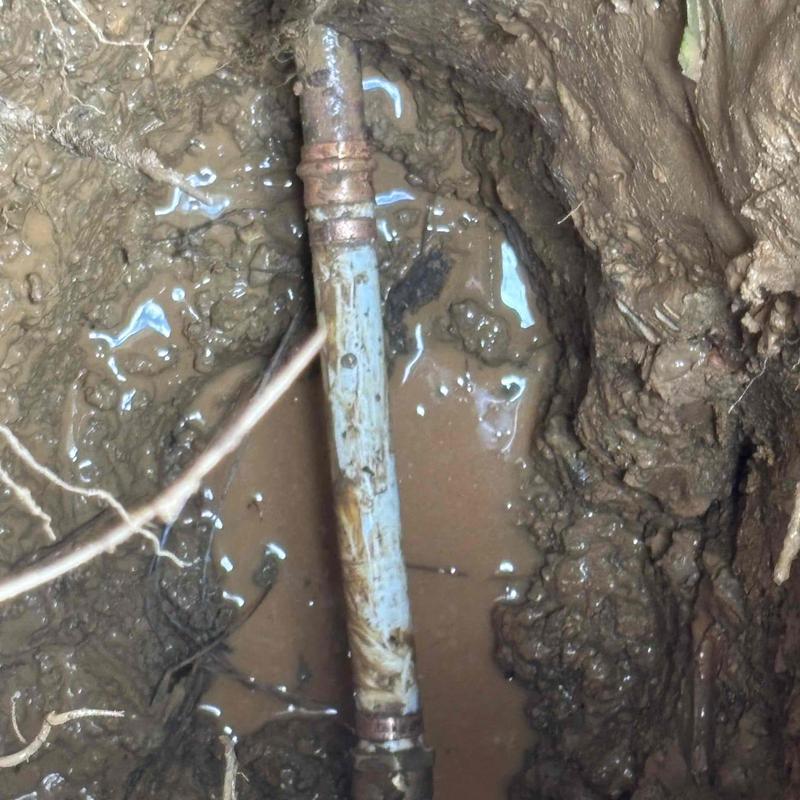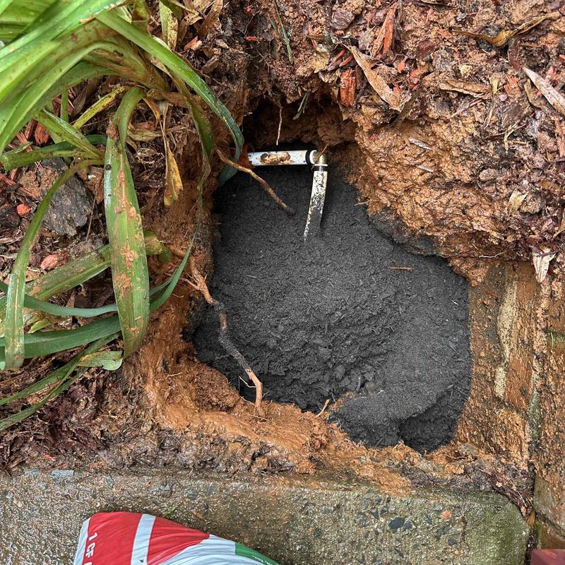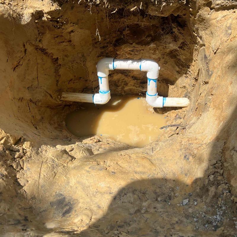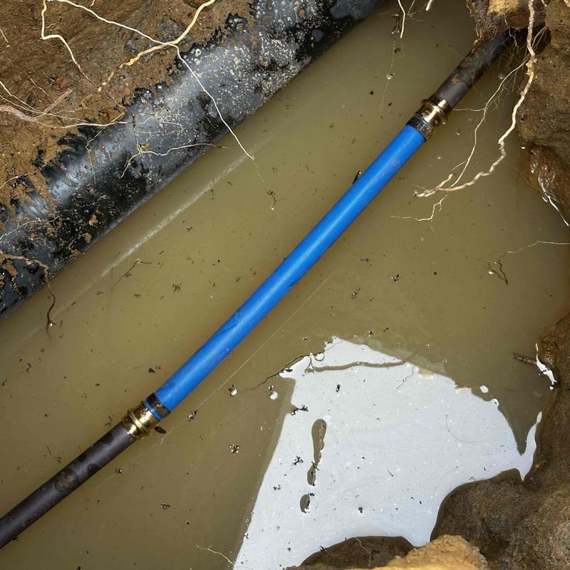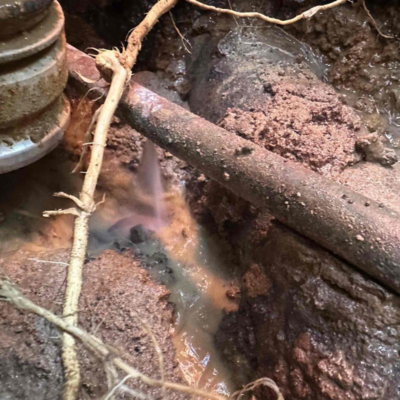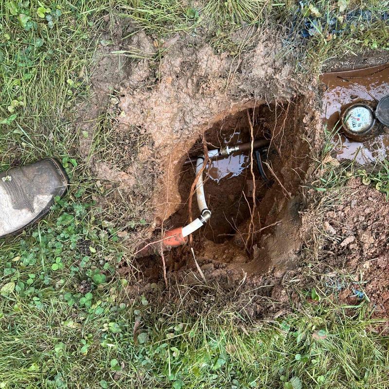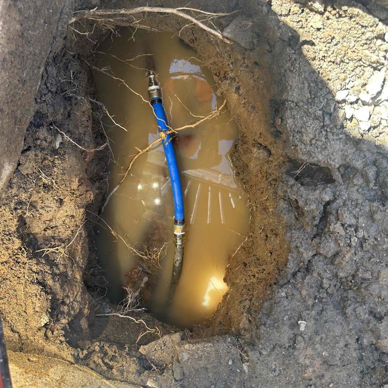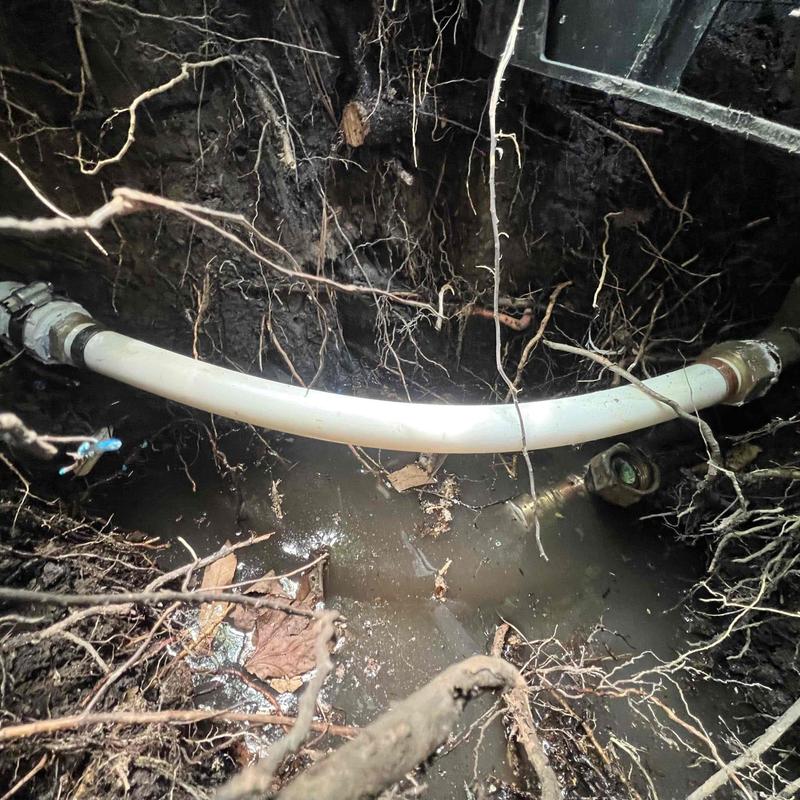A technician in Pineville, North Carolina performed hydro-excavation to expose a leaking one-inch main water line. They replaced the damaged section with PEX pipe, pressure tested the system at 60 psi, and confirmed no leaks. The technician backfilled the area and installed a new pressure-reducing valve due to a blockage in the existing one.