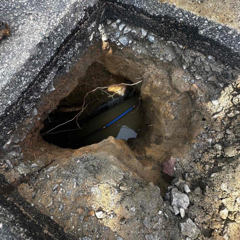 Contractors exposed and repaired a leaking water line beneath asphalt in Fuquay-Varina, North Carolina. Crews cut the asphalt, used hydro excavation to reach the pipe, fixed the damaged section, backfilled the trench, and restored the asphalt surface.