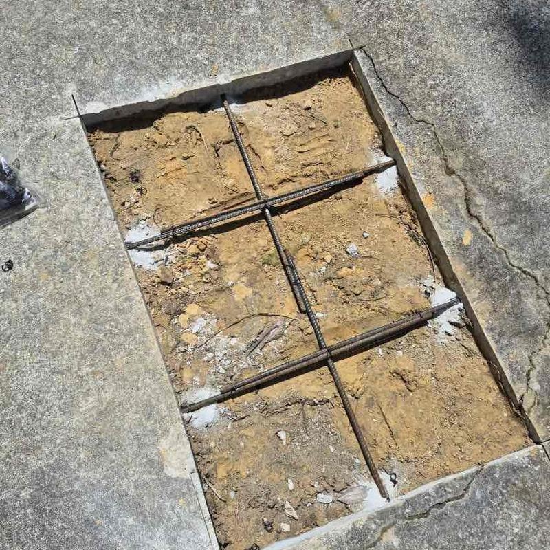 Hydro-excavation was used in Huntersville, North Carolina to safely expose a leaking water line with minimal soil disturbance. After the repair, crews repoured the concrete and added rebar for structural support.